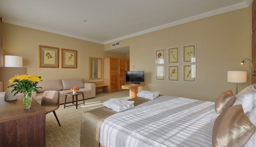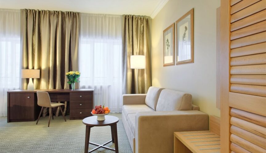 Номер категории «делюкс» оборудован для комфортного проживания. В номере предусмотрены односпальные кровати (или одна двуспальная кровать) для основных мест и дополнительное место на диване. В номере есть мебель: вешалка, диван, кресла, прикроватные тумбочки, стол, стулья и шкаф.